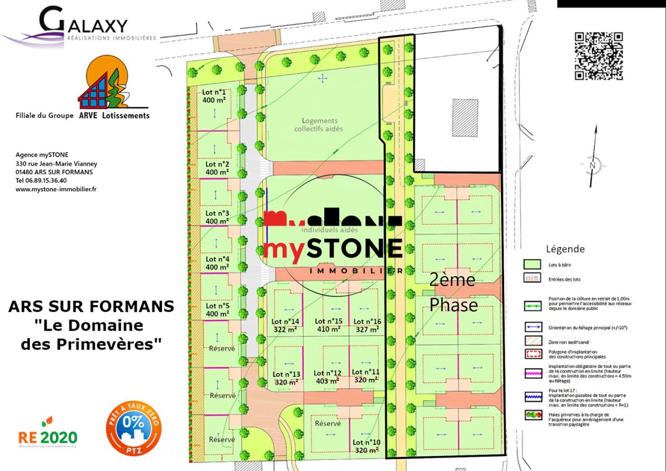 ARS SUR FORMANS – Terrains à batir viabilisé et libre constructeur avec des surfaces allant de 320 à 410 m² (133 500 à 139 500 euros). La viabilisation comprend : eau, électricité, téléphone, eaux usées, eaux pluviales. A 2 pas du centre ville, des écoles, commodités et ramassage scolaire. A 10mn de l’entrée d’autoroute de Villefranche s/s et de la gare TER. Le premier supermarché situé à Jassans est à 7km. Stéphane CLERGET (EI) Agent Commercial – Numéro RSAC : 901 499 145 – Bourg en Bresse.