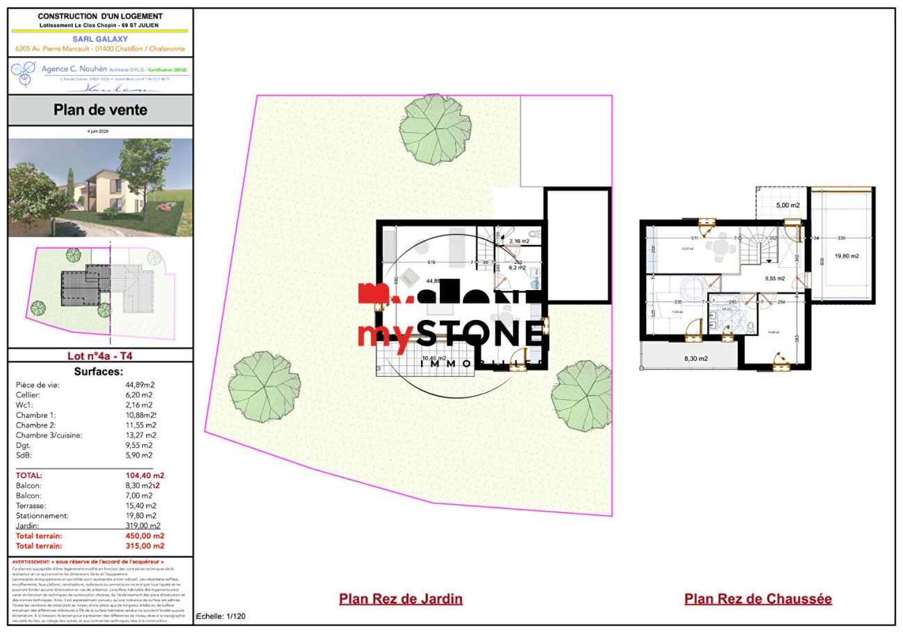 SAINT JULIEN – villa neuve en BRS – Frais de notaire réduits Maison de 104 m² habitable sur 450 m² de terrain clos et paysagé. Maison disposant d’une belle pièce de vie, avec 3 chambres et une salle de bains. Maison avec des prestations haut de gamme : volets roulants, garage motorisé, débord de toit PVC, système de chauffage par pompe à chaleur avec climatisation dans la partie vie. La maison est livrée prête à habiter (mur prépeint en blanc), il ne reste plus qu’à prévoir une cuisine équipée. Le terrain est engazonné et clos. Nadine VIRICEL (EI) Agent Commercial – Numéro RSAC : 842 735 664 – Bourg en Bresse.